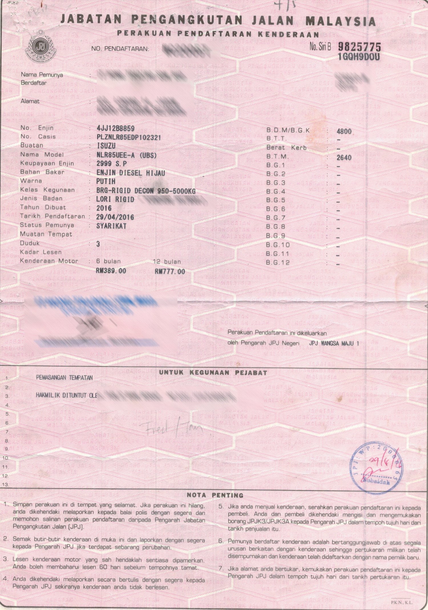 2. Selling Price for vehicle only, not included insurance, roadtax and handling etc.