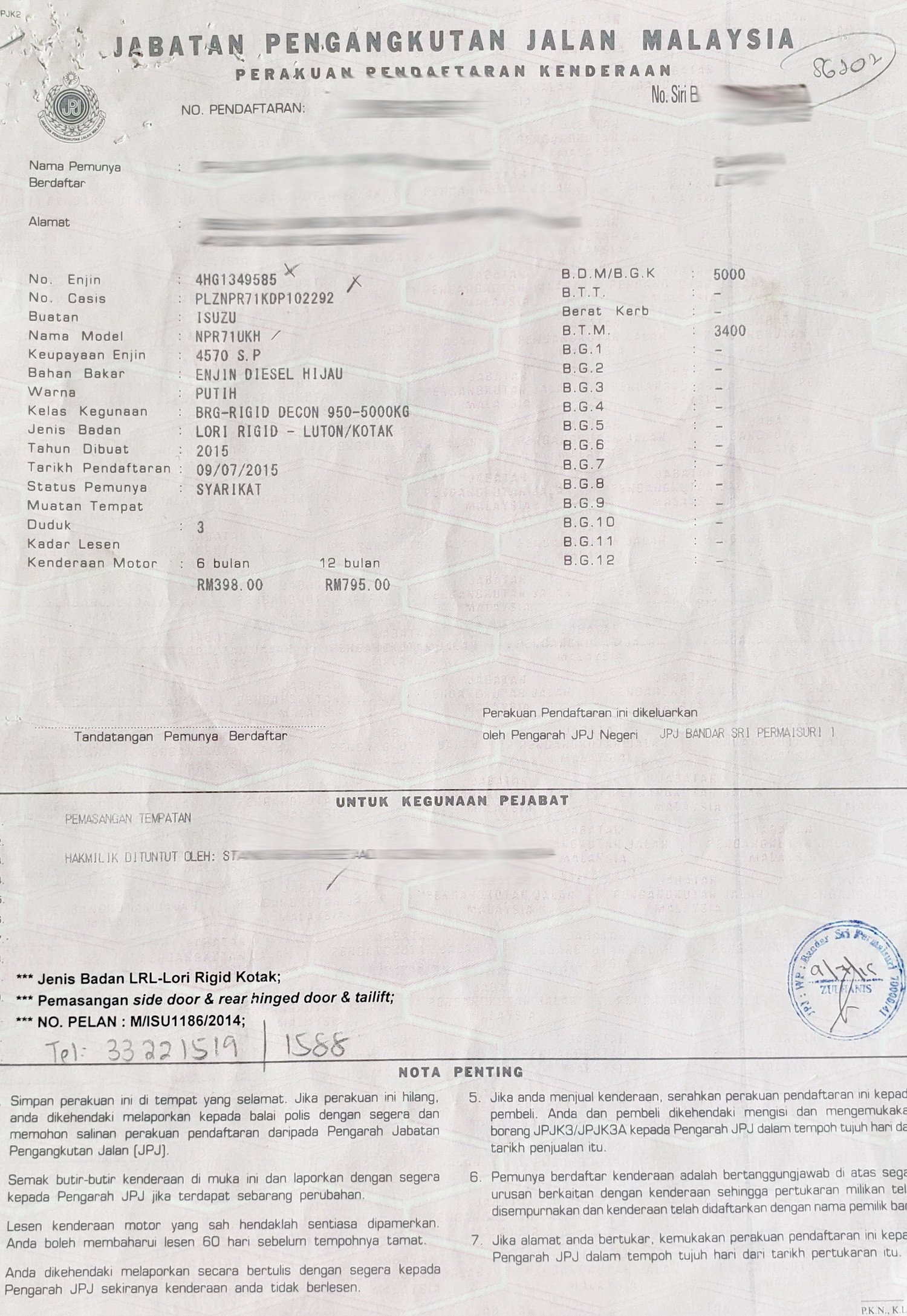 2. Selling Price for vehicle only, not included insurance, roadtax and handling etc.